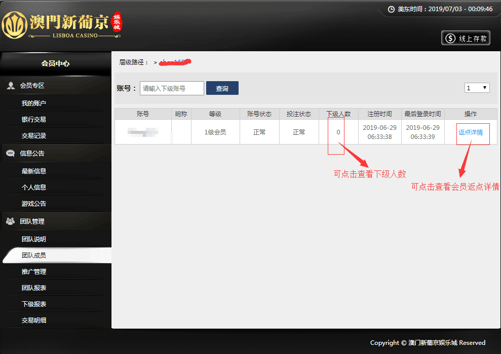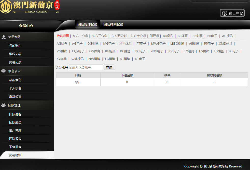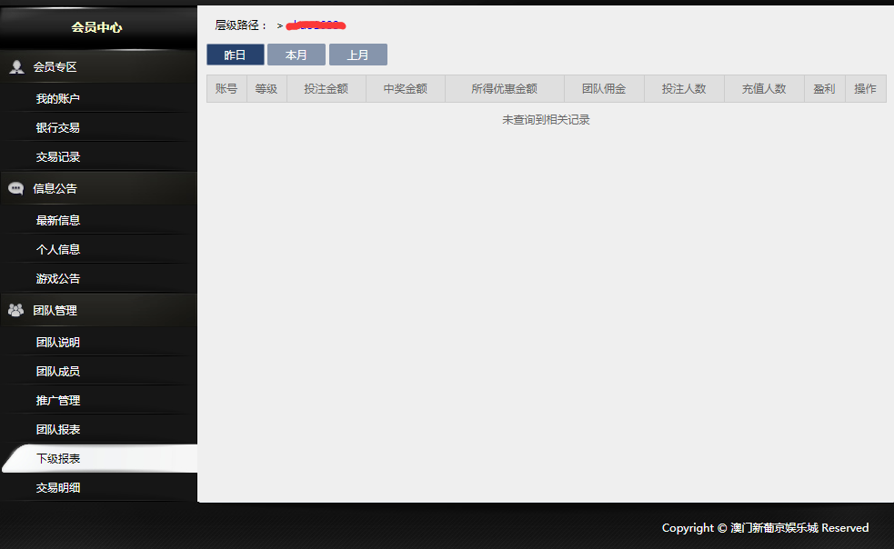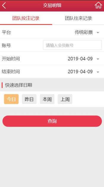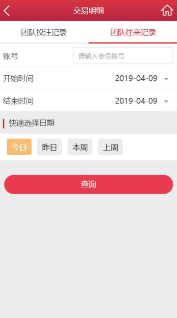 团队往来记录:输入会员账号,即可查询账号的往来记录;