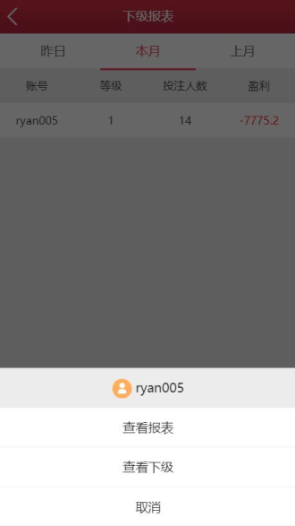 点击下级报表中的查看下级,可查看下级会员报表,若是没有下级,则不可点击;