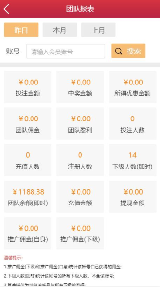 查看自身或下级团队不同时间段的报表数据,各个数据的统计规则和说明请参照:报表