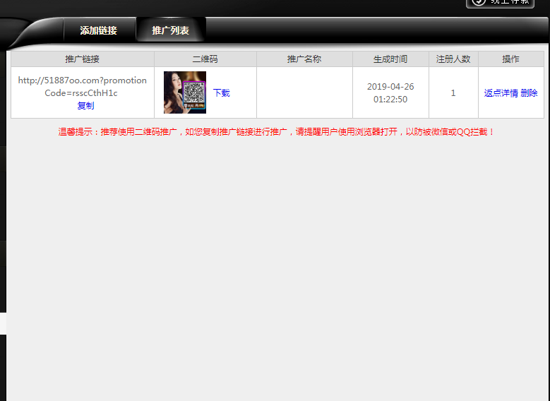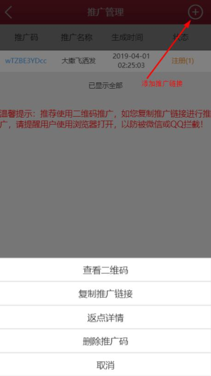 可复制链接地址或者下载推广二维码发送给推广对象;
