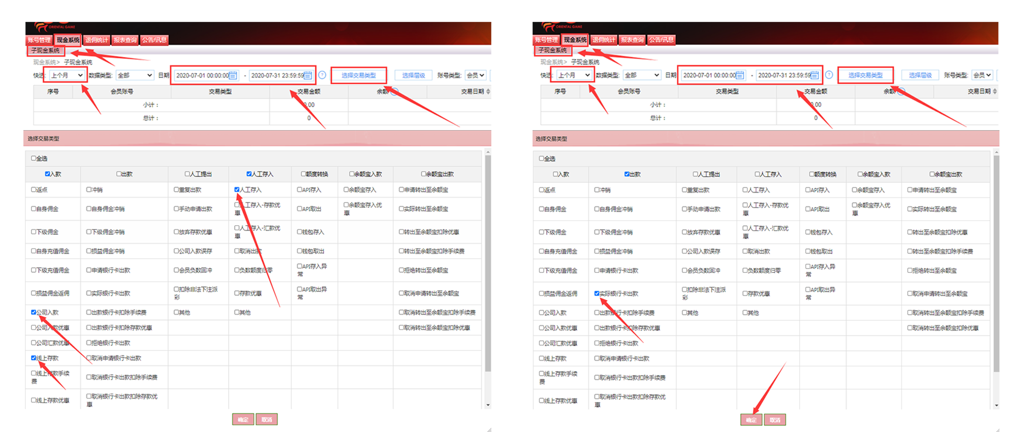 打开代理后台,点击现金系统--子现金系统 时间调整为需要查询的时间,点击选择交易类型 在入款栏勾选“公司入款“”线上存款“ 在人工存入栏勾选“人工存入”点击确定即可查询实际入款金额。